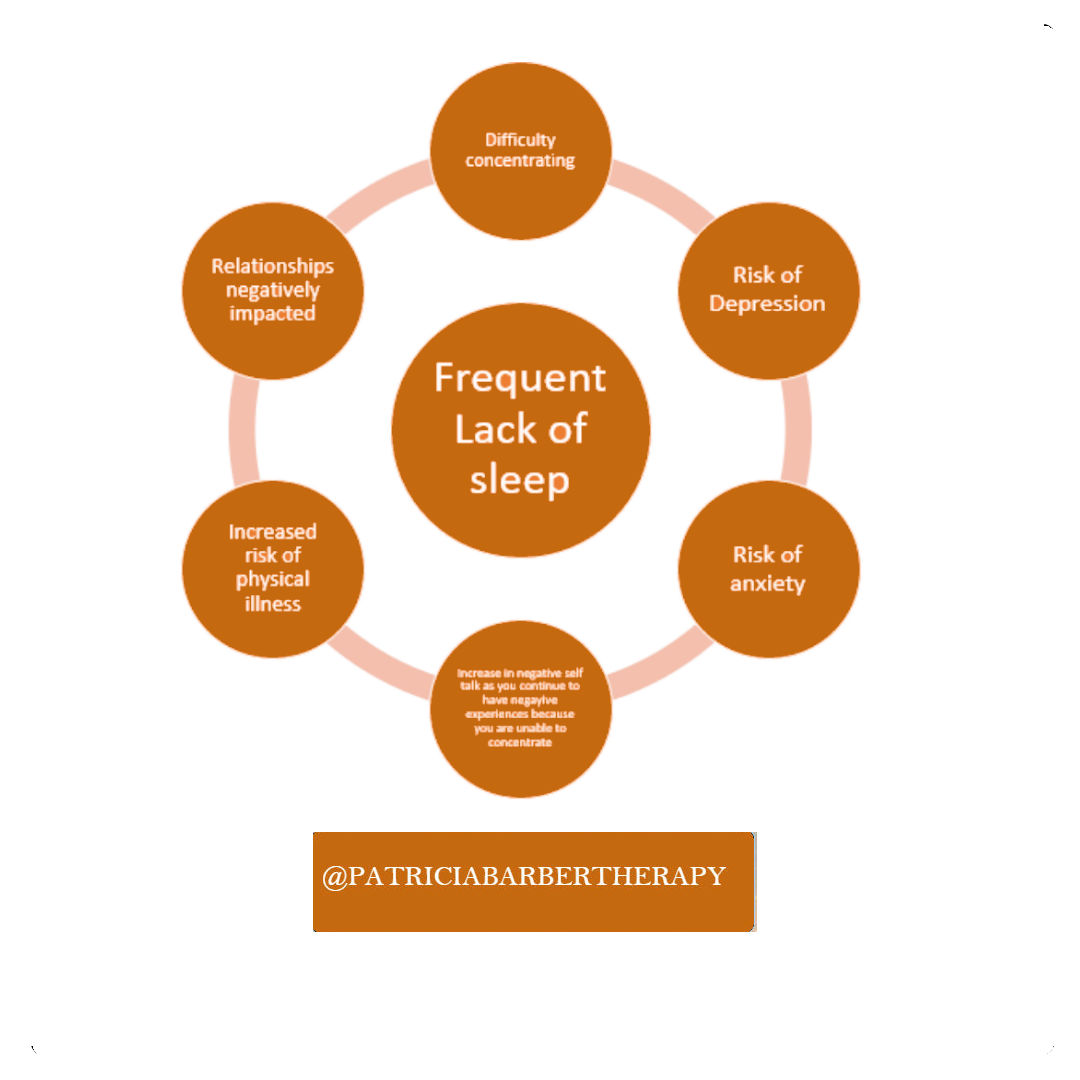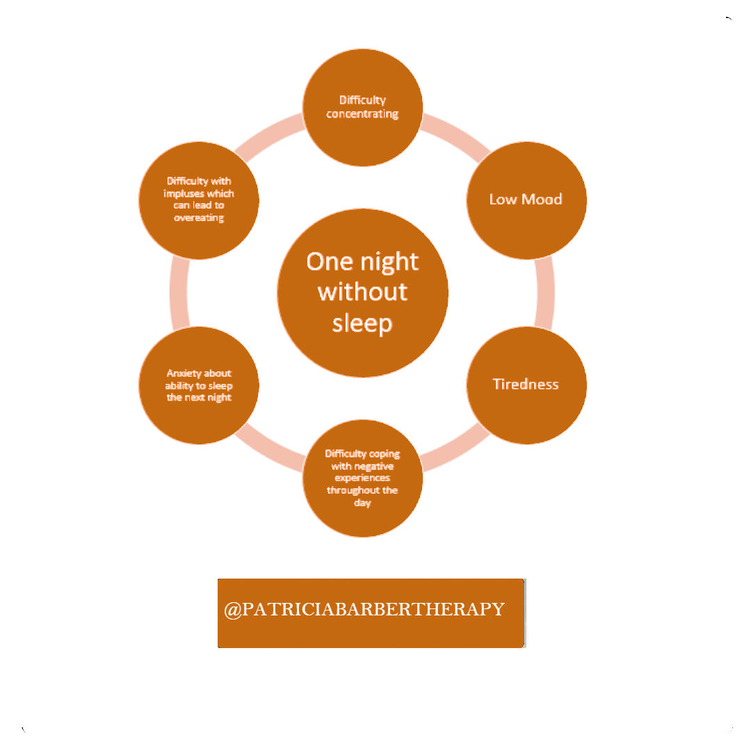 Figure 2 shows the impact of a frequent lack of sleep on our physical and mental health. This includes a higher risk of depression, anxiety and physical illness. The impact of a frequent lack of sleep would appear to permeate across all aspects of an individuals well being and for this reason sleep is an important component of working together in therapy.