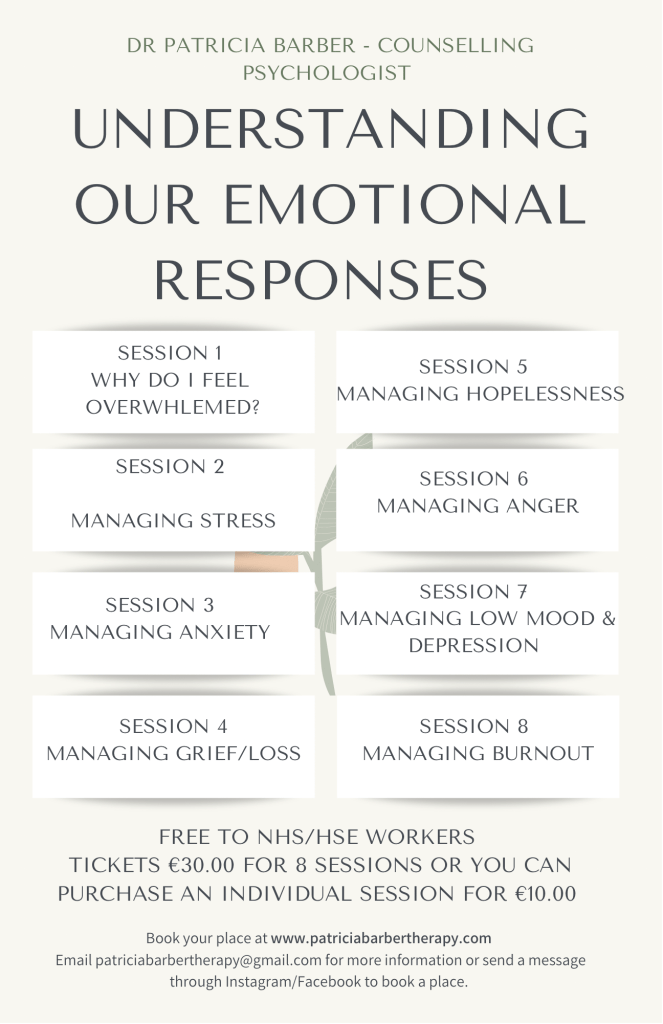 Please select below to book your place on the FULL course or if you wish to book for a particular session you can do so by purchasing that session only. If you are a HSE/NHS worker please contact me directly to avail of a funded place.